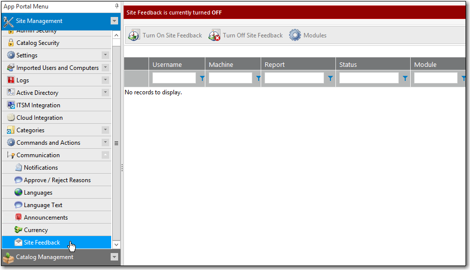1. On the Admin tab, select Site Management > Communication > Site Feedback . The Site Feedback view opens, and displays a note stating that site feedback is currently turned off.