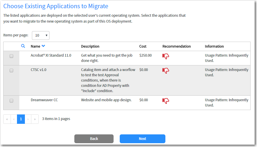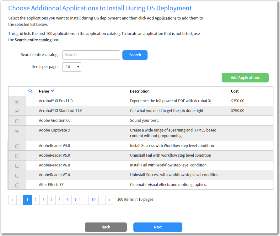 9. Select the applications that you want to migrate and then click Next . The Choose Additional Applications to Install During OS Deployment panel opens. Applications that have already been selected in previous panels are already selected and cannot be unselected.