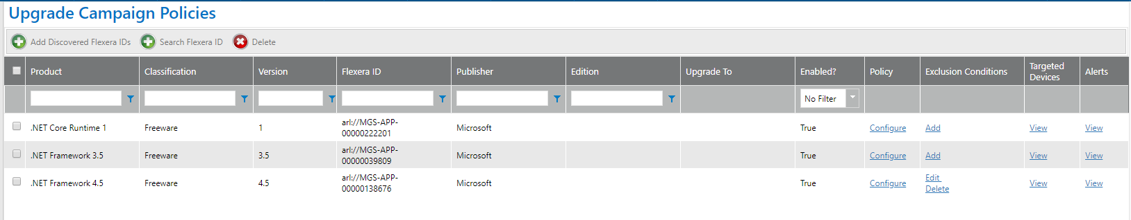| Search Flexera IDs | Click to create a campaign to upgrade an application that could be installed in your enterprise in the future. The Search for Flexera ID view opens, listing all of the existing applications/versions in the FlexNet Manager Suite database. |